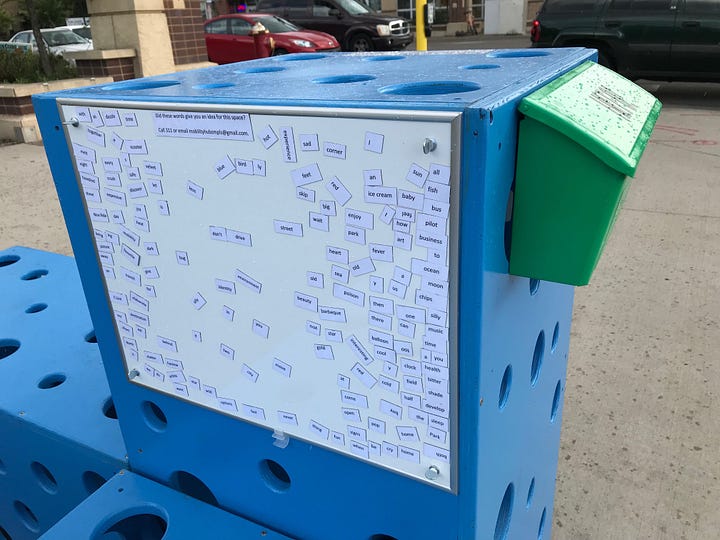 If people are encouraged to make small changes to a space - such as moving a piece of furniture to find the shade, manipulating play equipment, or creating a small poem on a magnet board while they wait for the bus - they are going to feel a greater ownership over that space, and thus, be more interested in taking care of it. They will be more likely to care for the wellbeing of the space, and feel that they belong there.